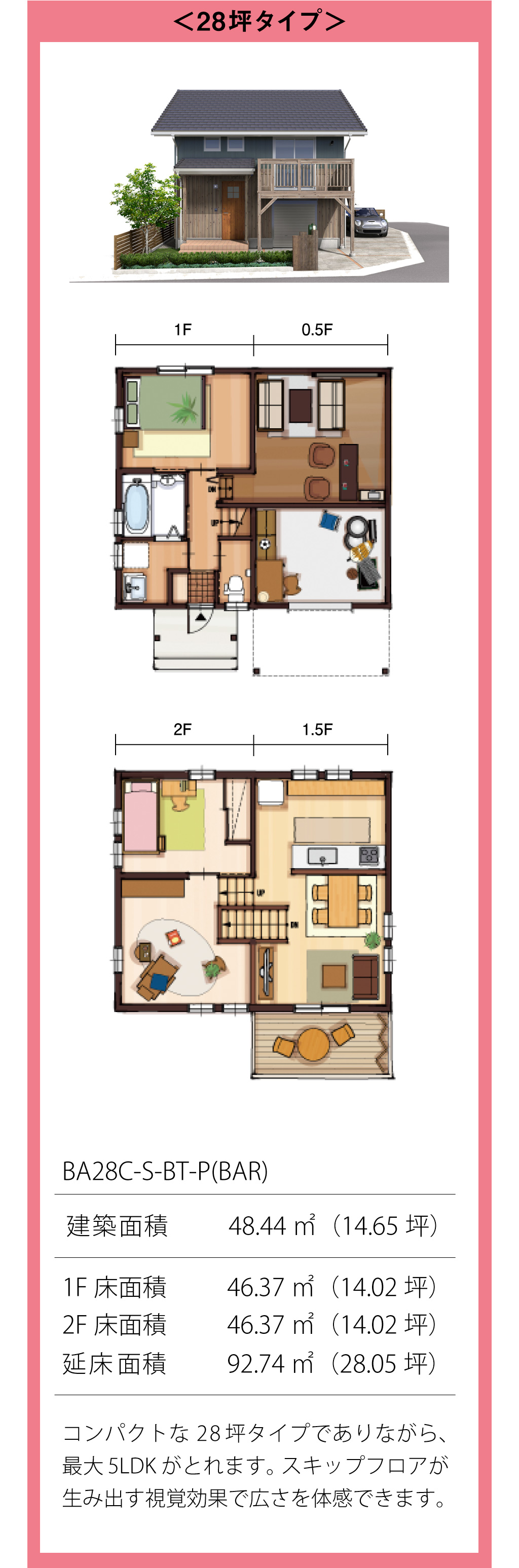 シンプルで落ち着きのあるデザインのファサードです。1.5階のウッドバルコニーは、開放的な展望台。家族をさりげなく外へと連れ出してくれる設計です。