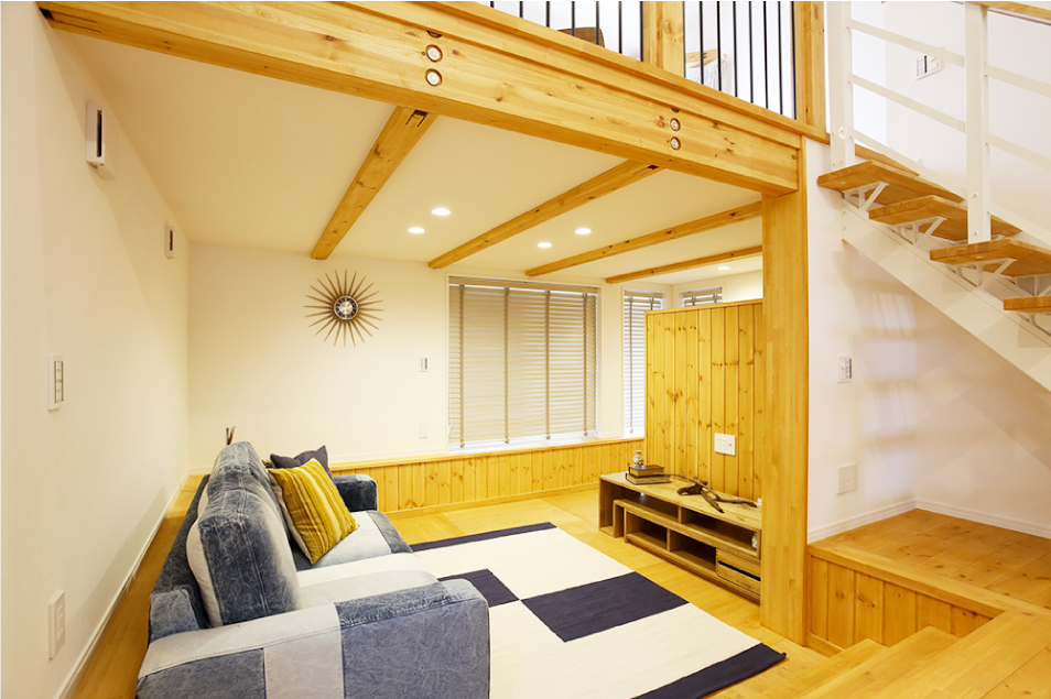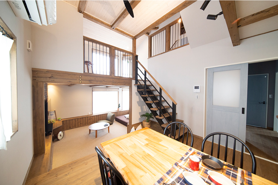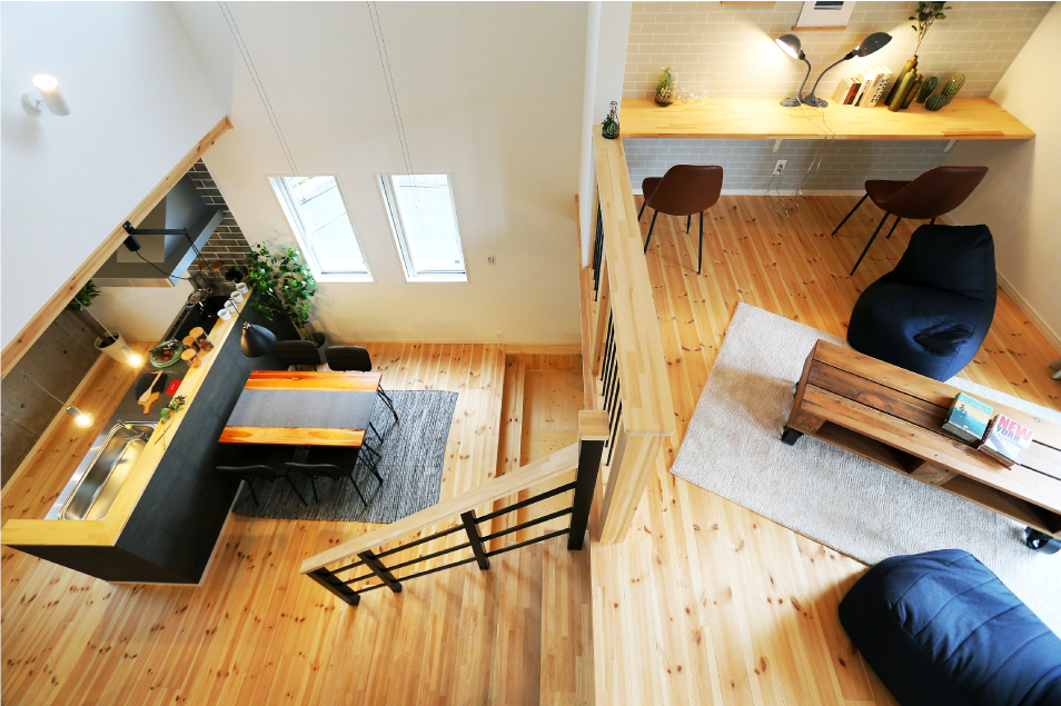 スキップ構造がリビングからダイニングキッチン、吹き抜けの上層階までつながる大空間を実現。家族が自由に過ごしながら、空間を心地よくシェアできます。