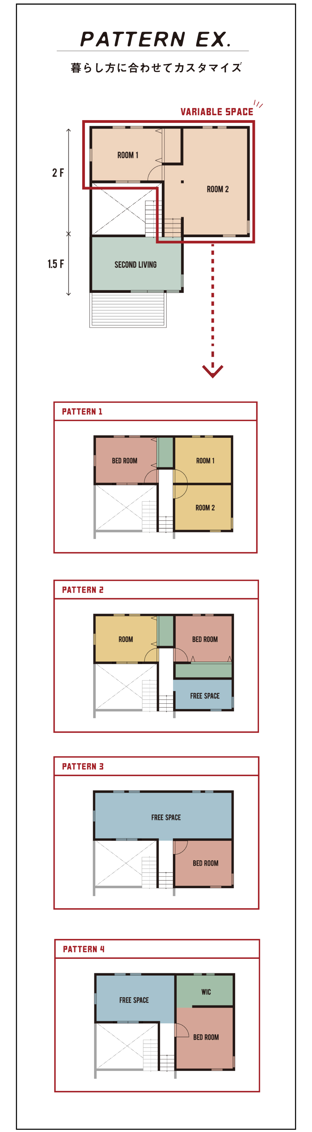 暮らし方によって自由にカスタマイズできる間取り。例えば子ども部屋を広めに作って将来的に区切れるようにしたり、服好きさんなら大容量のウォークインクローゼットを作ったり。毎日を豊かにする自分の居場所を好きに作れます。