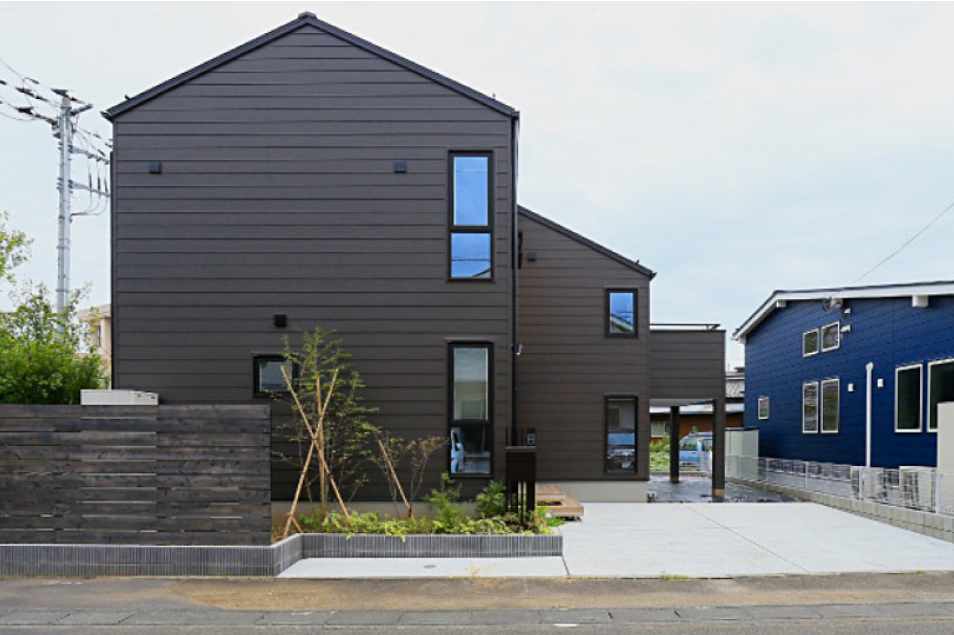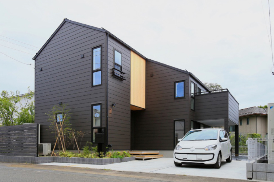 建物の左右で奥行きが異なる、印象的なフォルムの外観。玄関上側には天然の木材をあしらうことができ、独特の存在感を醸し出すアクセントとなります。