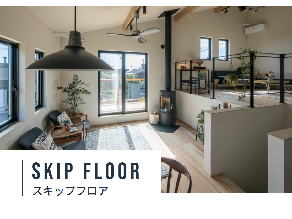 スキップ構造がリビングからダイニングキッチン、吹き抜けの上層階までつながる大空間を実現。家族が自由に過ごしながら、空間を心地よくシェアできます。