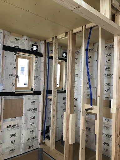 透湿防水紙の施工状況として、上下左右の重ね合わせ長さの確認、換気扇や電源等による壁貫通部分の止水処理の状況、軒廻りの防水テープの施工状況の確認等をおこない検査合格です。