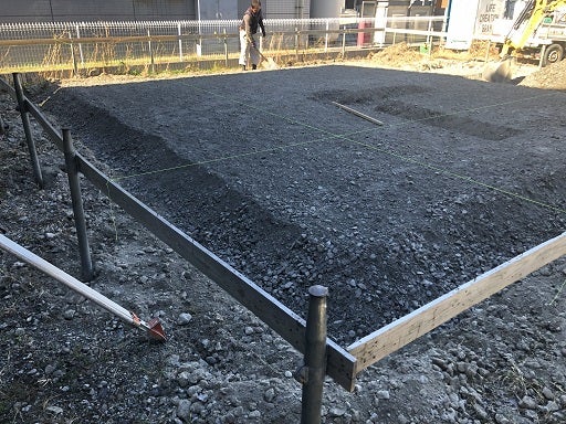 基礎工事は順調に進んでいます。掘削工事後、砕石事業を進めました。転圧状況もしっかりと確認しております。