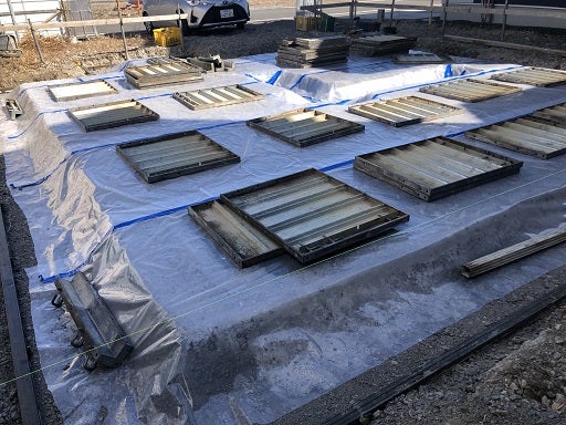 砕石事業の後、土壌処理として防蟻工事を進め防湿シートを敷き詰めます。