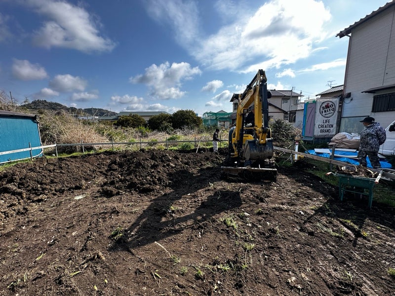 設計GLに合わせて地面を掘っていきます。配置確認の時に設置した遣り方板を基準にして高さ確認をしています。今日明日でこの作業を行い、その後は砕石を入れていく予定です。 基礎完成まで約1か月、楽しみにしていてください!