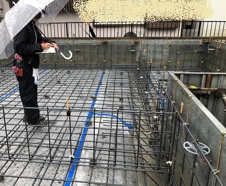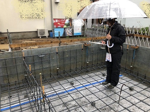 基礎工事は鉄筋を組む工事まで終了したところで、社内の配筋検査を実施しました。