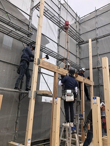 2階の柱・梁そして垂木(屋根)へと作業は進みます