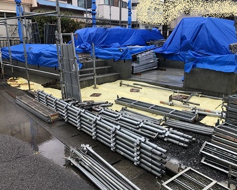 本日は建て方作業前の最終準備として外部足場を組んでいます。