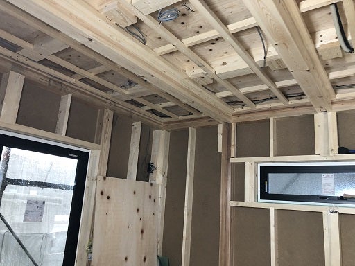 内部も外部も工事は順調に進んでいます。外部の耐力面材、梁や柱の接合金物の取付等の主要構造部分の施工が完了したので、早速社内の構造躯体検査を実施しました。耐力面材の種類及び位置、釘の長さ太さ間隔の確認、土台と柱の緊結、柱と梁の緊結、梁と束の緊結状況の確認、火打ち梁の接合の確認、床合板の厚さ、釘の間隔等の確認をし