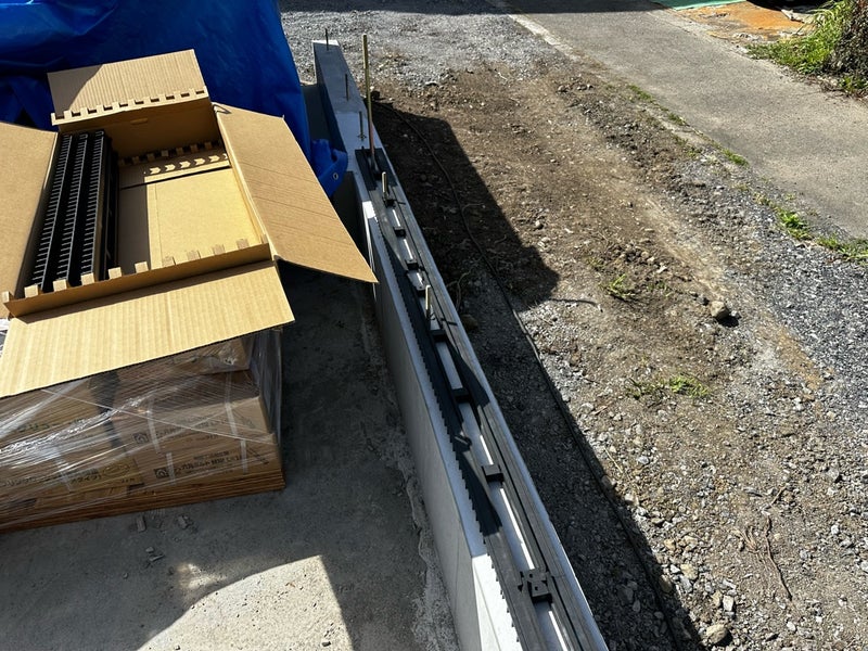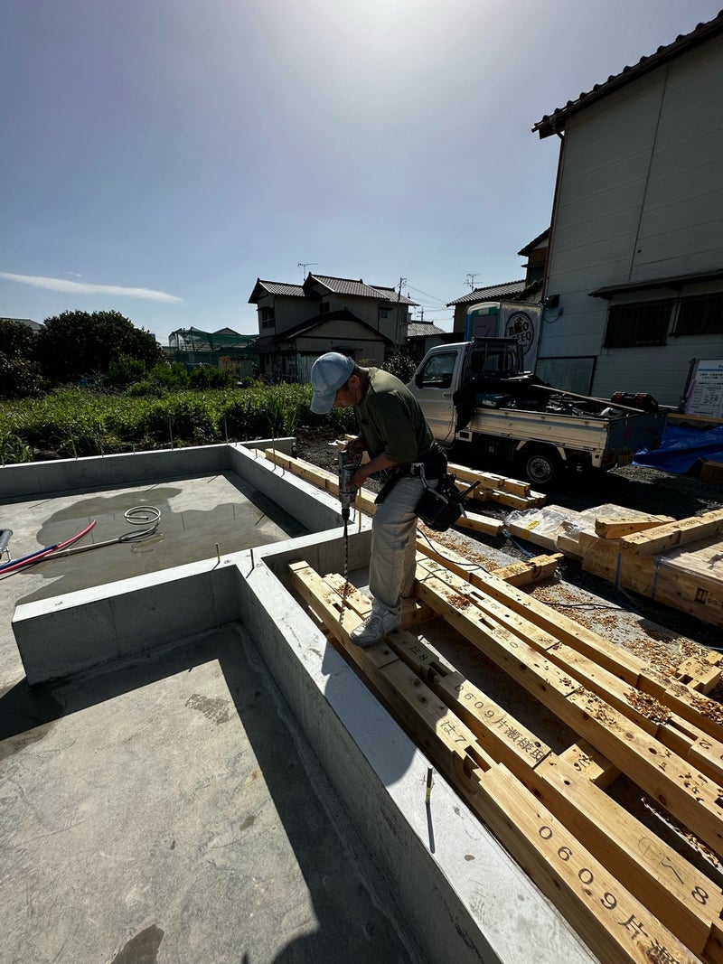 まずは基礎から出ているボルトの位置を確認して土台に穴を空けていきます。同時に基礎の天端に基礎パッキンを並べていきます。基礎パッキンを入れる事で土台と基礎の間に隙間が出来て床下の換気ができるようになっています。