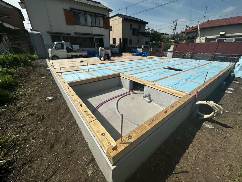 土台、大引きを据えて床断熱材を入れていきます。最後に床合板を敷き養生シートとブルーシートを二重に被せて土台据え完了です。