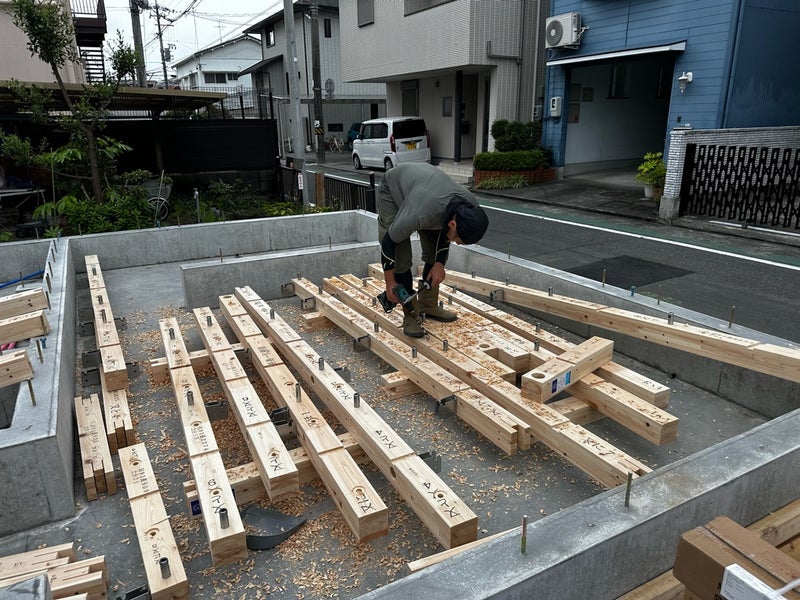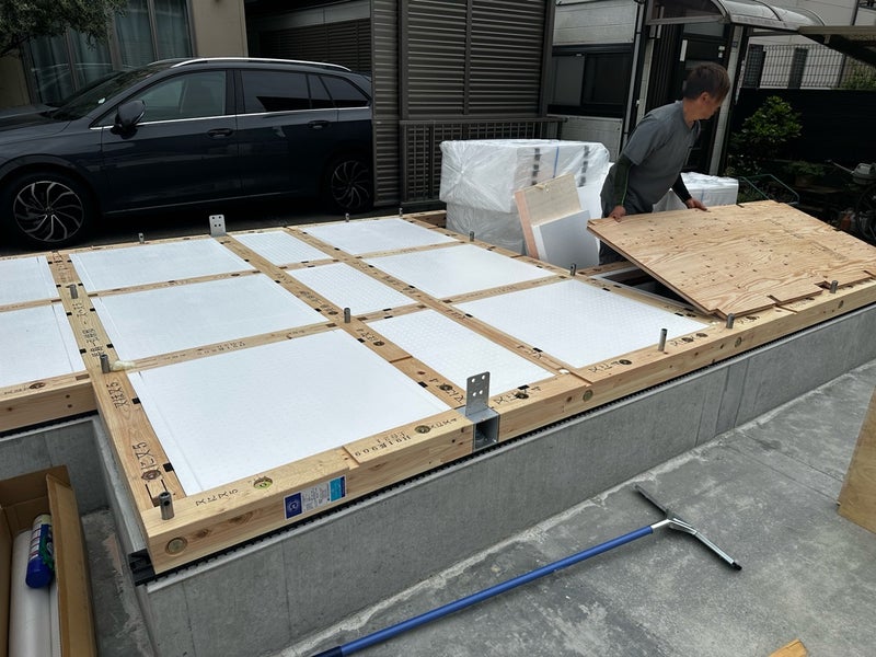 最後に床下断熱材を入れて床合板を敷いたら土台据え工事完了です。