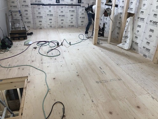 床板を貼る前に今一度、床下地である構造用合板の釘の確認と増し打ちを行い一枚一枚施工します。床板を貼るとすぐに傷や汚れ防止のために養生をしてしまうので一面に広がる床板を見ることができるのは完成時になります。H様、楽しみにお待ちください。