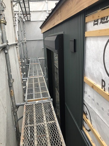 全体の4分の3くらい貼り終わっています。換気フードの取付も並行して進め、シーリング工事もできる所から進めていく予定です。今月の半ばくらいには全ての外壁が貼られます。