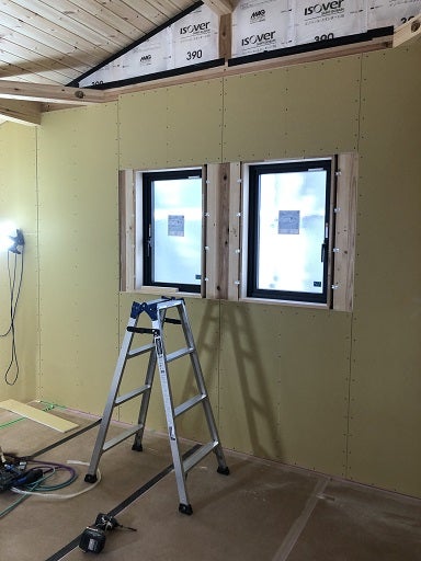 下地の位置を再確認して、ビスを指定の間隔で打ち付けてプラスターボードを固定していきます。引続き、2階より造作工事を進めます。