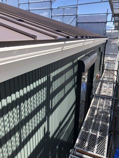 外部は外壁工事が終了後、シーリング工事を経て、破風鼻隠しの板金巻き工事、雨樋工事を進めました。