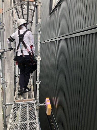 そして、外部工事が全て終了したので、早速社内の『足場撤去前検査』を実施しました。軒樋の勾配の確認、縦樋の固定の確認、破風鼻隠しの板金工事の施工状況の確認、サッシ廻りや換気扇廻りのシーリングの施工状況の確認、外壁の仕上がり状況の確認等を行い、社内検査合格です。
