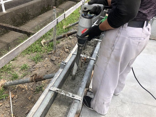振動機を使い隅々まで、コンクリートを流し込んでいきます。