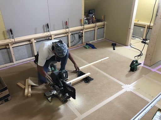 床仕上げも終了しました。基礎部分の囲いの木下地や笠木の取付もほぼ終了しています。そして、現在1.0階から0.5階への階段を作成しています。