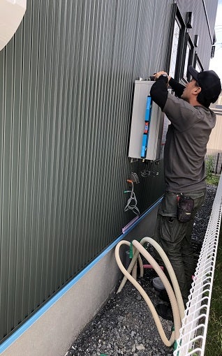 外部工事は、足場が撤去され基礎部分の仕上げまで終了しました。本日は給湯器の設置を進めています。