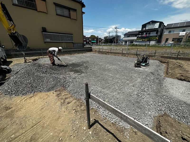 掘り方作業で地面を掘っていきます。砕石を敷いて十分に転圧をしたら掘り方完了です。この後は土壌処理、外周部の型枠設置を行い配筋作業へと進んでいきます。