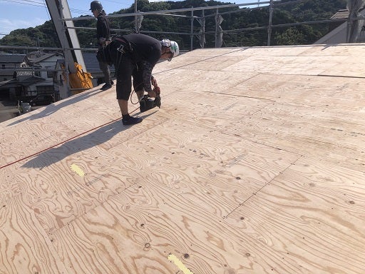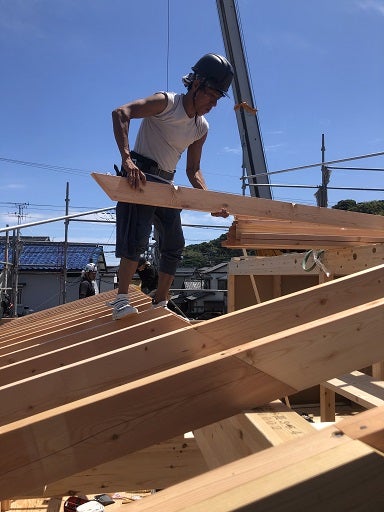 最後に野地板及び石膏ボードを貼り込み、建て方作業終了です。
