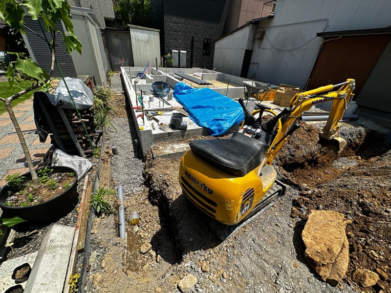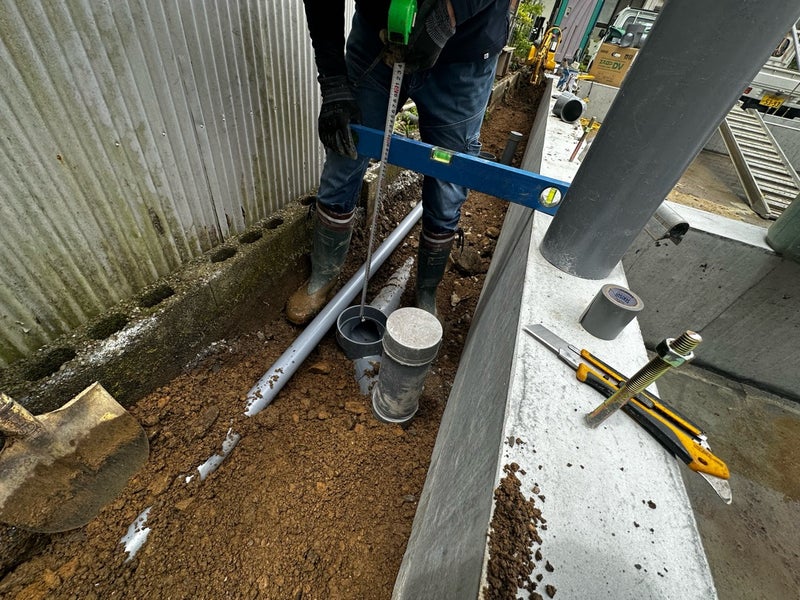 基礎工事が終わり、水道の給排水管の工事を行いました。排水の勾配や深さをチェックしながら排水管と枡を各所に設置しています。