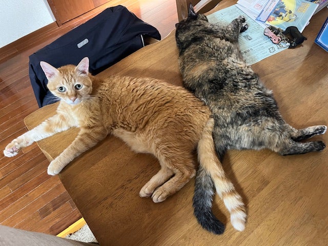 さて我が家のにゃんズ(でん・チビ)何か不満が有るのか!?ダイニングテーブルの上でくつろぎ中。躾を間違えた?(^_^)