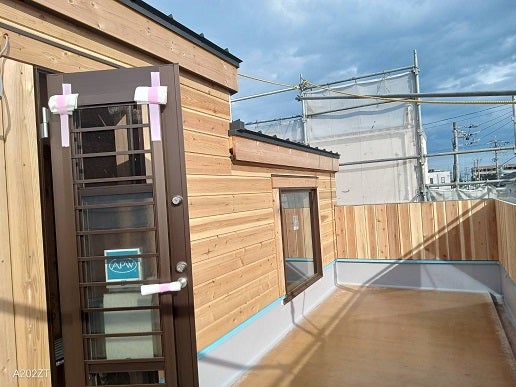 屋上の杉板貼りが完成しました。(^^♪木の自然な風合いが感じられて縦張り、横張りのコントラストが綺麗です。この後は、塗装工事、板金工事を進めて行きます。見晴らしも良くて屋上でバーベキューをやったりと…夢が膨らみますね!