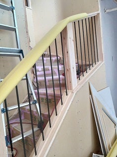 大工工事もいよいよ終盤!階段の手すりを施工しました。鉄筋棒が入る穴も棟梁が手作業で開作業し、水平・垂直をしっかり確認しながら取り付けていきます。