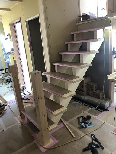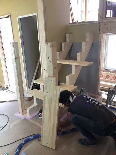 内部では、棟梁が1階から1.5階部分の階段の取付を進めています。