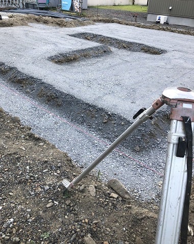 建物の配置の基準となる寸法を再確認し、建物の高さの基準となるポイント及び設定GLを確認し、根切、掘削開始です。掘削深度を確認しながら進めていきます。そして砕石を入れて十分に転圧します。