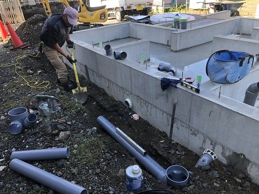配管経路や地盤面の高さ、勾配の確認、各設備の収まり等の確認を再度職人さんとし、作業を進めます。