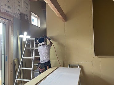 棟梁は最後の一部屋LDKの壁のボード張りを施工中です!この後、社内検査で壁・天井のプラスターボードの割れや欠けの確認、ビスの間隔、内部耐力壁のチェックを行う予定です。今週は階段の作成も予定しています。スキップフロアのお家のN様邸には、大小5箇所の階段があります。