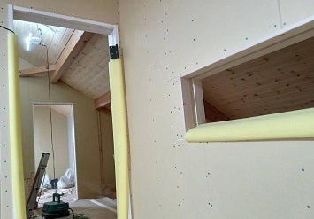 内部工事は木工事が順調に進んでいます。2階のプラスターボード張りが終わり、各部屋ごと仕上げています!ボード張りの終了後に、ボード種類の確認、ビスピッチが基準通りに施工されているか、ボードの割れがないか等をしっかり確認しました!