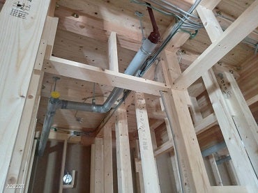 内部は壁に断熱材を充填する前に、給排水配管工事と電気配線やコンセント・スイッチの取付工事が進んでいます。