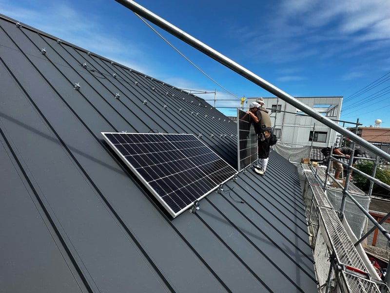 太陽光のパネルを載せる工事を行いました。まずはパネルを固定するための金具を屋根のハゼ部分に取り付けます。金具が取り付けられたら配線を確認しながら1枚ずつ丁寧に並べていきます。今回は全部で16枚のパネルを載せました。方角、陽当たり共に条件が良いのでたくさん発電してくれるはずです!