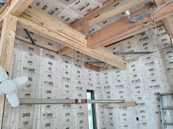 この後、社内検査で断熱材の種類や厚さ、隙間なく充填されているか、サッシ廻りの気密処理などのチェックを行います。検査合格後、今週は天井下地工事を進めて行く予定です。O様、工事の進捗を楽しみにしていて下さいね!