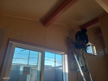 木工事が終了したので内部は塗装工事を進めています。外部に面した木部やキッチンカウンター、洗面脱衣所は紫外線や雨、湿気や水などから守る性能を備えるウレタン塗装を行います。