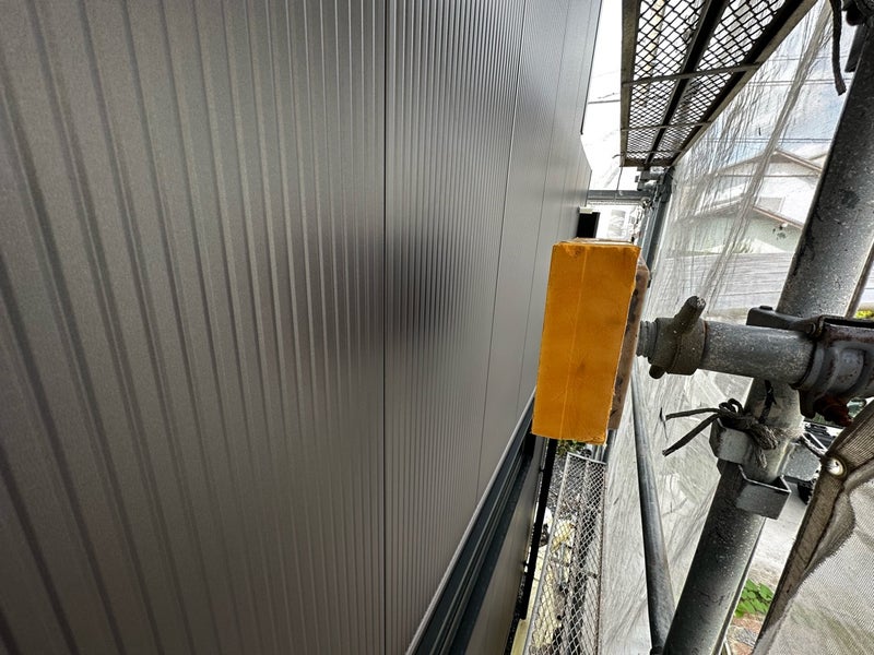 撤去前には外壁最終チェックを行なっています。キズや汚れがないかを見ながら全体的に掃除をしています。問題がない事が確認できたので本日、無事に足場が撤去されました。