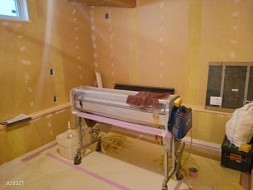 内部では仕上工事が進んでいます。クロス屋さんが壁のプラスターボードのビスや継ぎ目などに下塗りから仕上げ塗りまで綺麗にクロスが貼れるように入念に3回パテ処理を行って下準備をします。