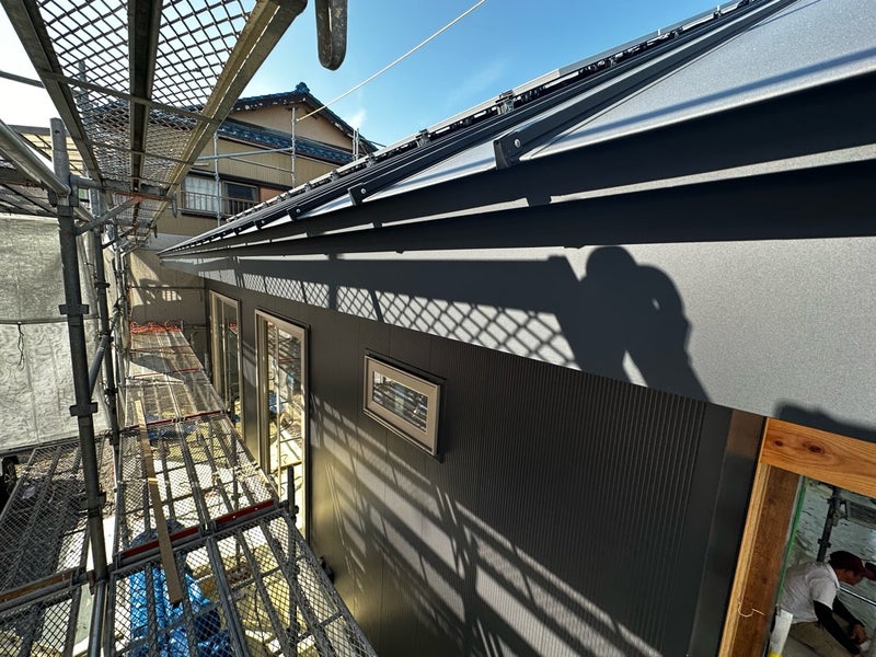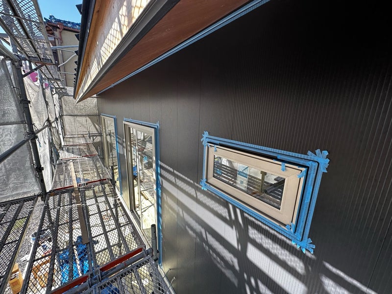 屋根破風板の板金工事も完了しています。この後にアンテナの取り付けなどを行なったら外部の工事完了です。もう少しで足場が撤去されます。建物の全体像が見れるまで楽しみにお待ち下さい!