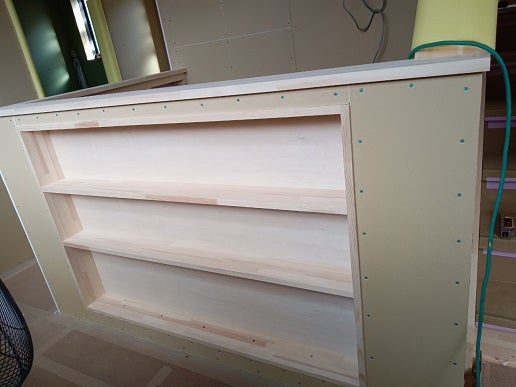 階段の笠木の下の腰壁を利用して、ちょっとした本棚を作ってみました。