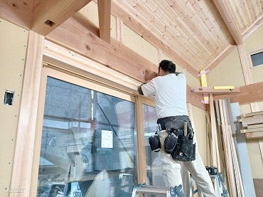 そして、棟梁はサッシ上の鴨居の施工中。本日は、外装施工完了後の仮設足場撤去前監査を受ける予定です。