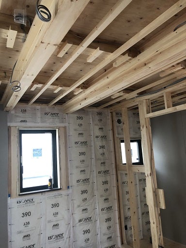 第三者による断熱材の施工監査を終え、棟梁は1階及び2階の天井下地組みを進めています。