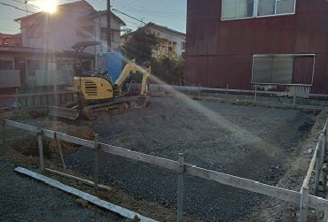 基礎形状に合わせて地面を掘削し砕石を敷き転圧を行い基礎作りが順調に進んでいます。