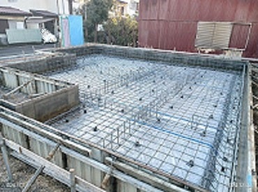 そして、外周部の型枠組みを行い基礎配筋工事に取り掛かります。底盤一面が鉄筋コンクリートになり、家の荷重を底盤全体で受け止めて支えるべた基礎施工です。