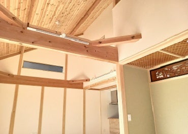 仕上工事も終了しクリーニングを行いました。屋根勾配に合わせた勾配天井にパイン羽目板張りがおおらかな空間にとても馴染んでいます。