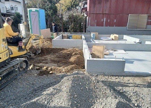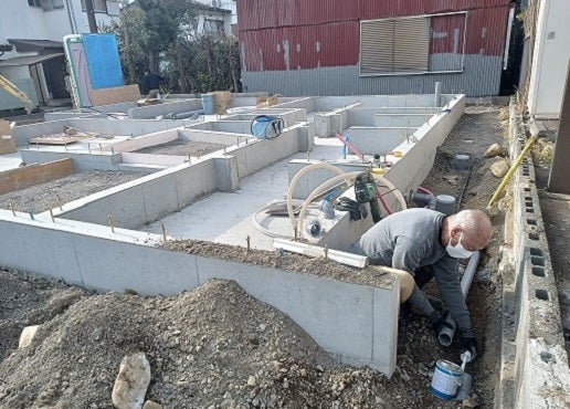 これは、外部から敷地内に引き込まれている給排水管を建物内の衛生器具に接続するために引き入れたり、排水管を地中に張り巡らせたりする作業です。