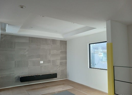 クロス工事が完了し、スイッチや照明器具、トイレなどの衛生器具の取り付けを行なっています。